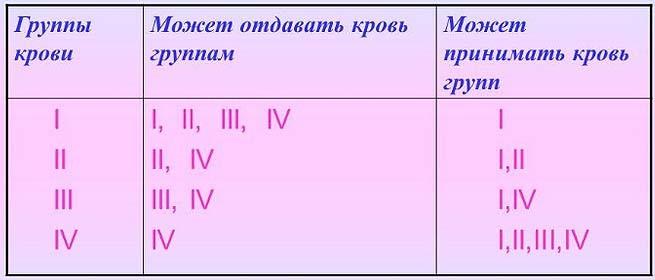 | Таблица совместимости групп крови у человека |