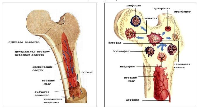 Многообразная и напряженная работа костного мозга – рождение и созревание клеток крови, их поступление в кровяное русло – осуществляется в течение всей жизни человека. Это происходит благодаря слаженной работе всех его органов и необыкновенно экономичному использованию костным мозгом продуктов, необходимых для построения и созревания клеток крови (белков, витаминов, железа).