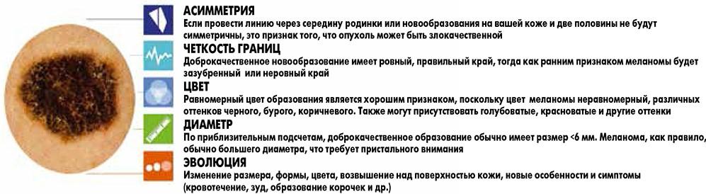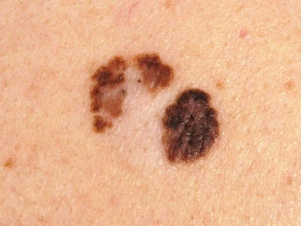 Гораздо сложнее распознавание и лечение меланомы. По темной окраске меланому легко отличить от других злокачественных, новообразований, но трудно от часто встречающихся пигментных невусов (родинок). Превращению пигментных невусов в меланому способствуют травма, ультрафиолетовое излучение и гормональная перестройка организма.