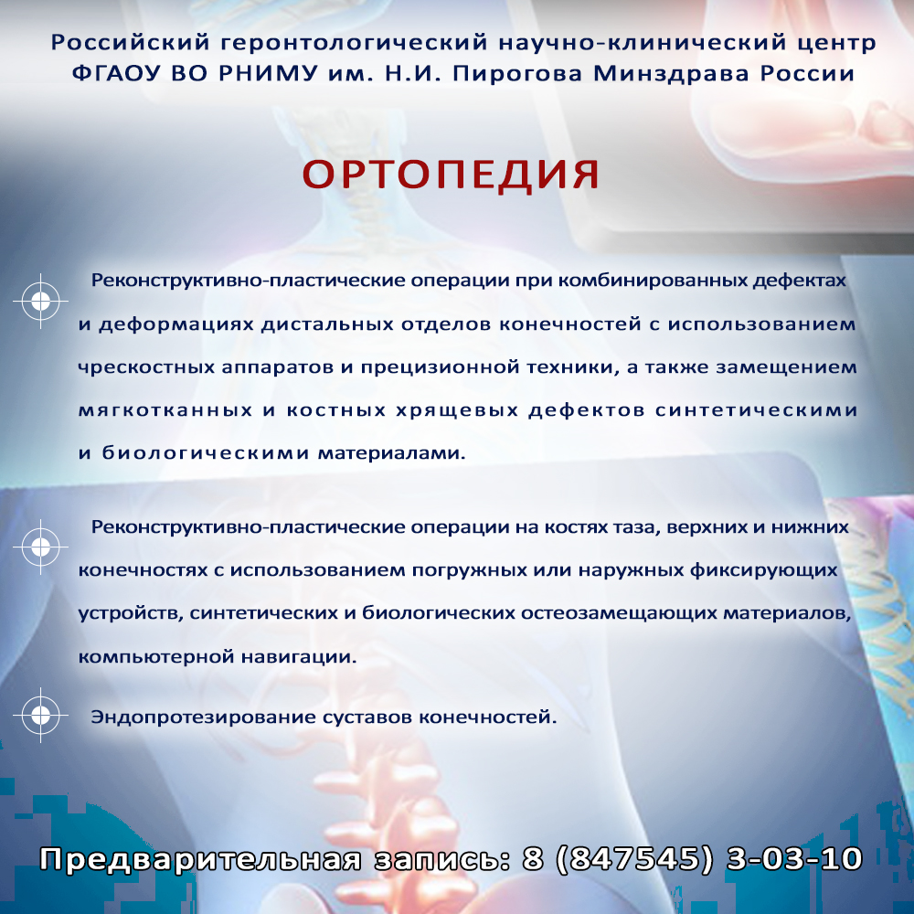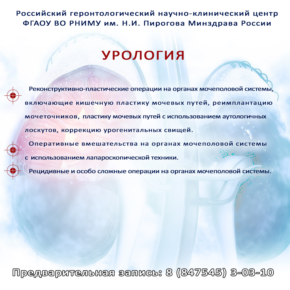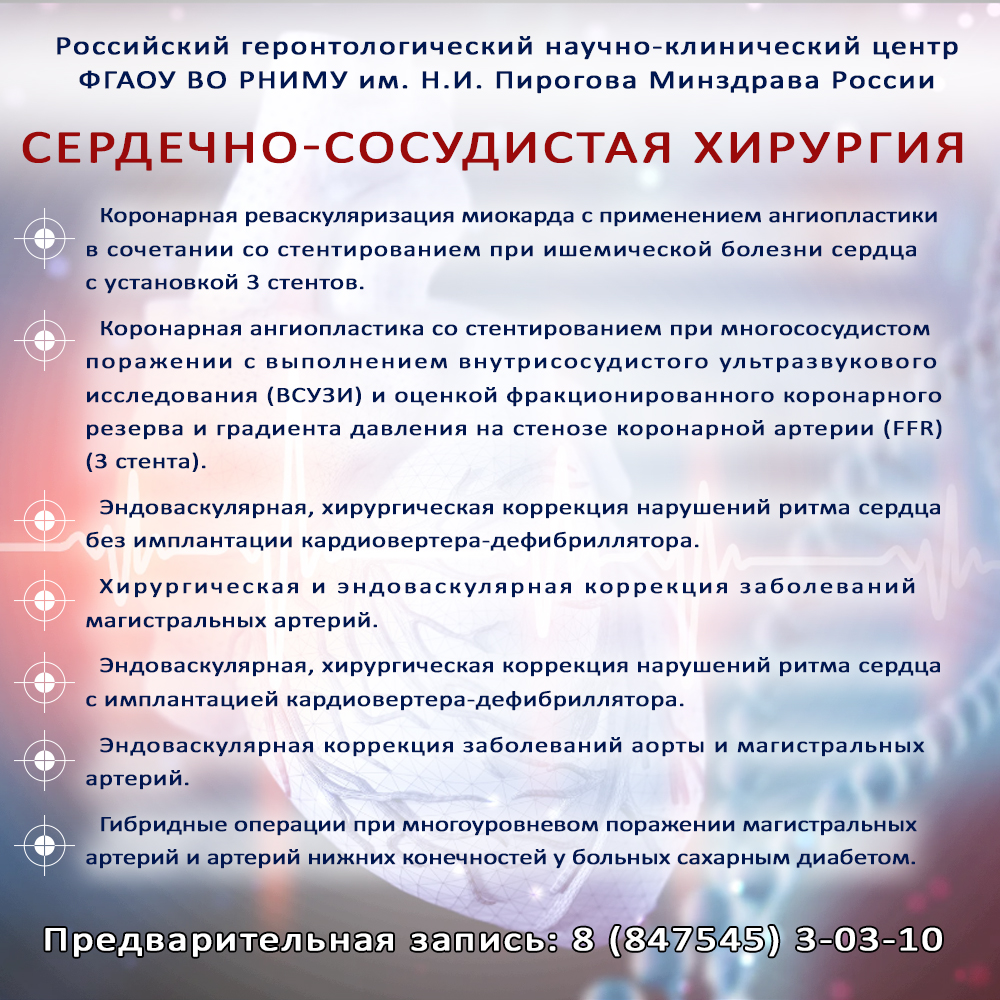 Для справки: Обособленное структурное подразделение - Российский геронтологический научно-клинический центр ФГАОУ ВО РНИМУ им. Н.И. Пирогова Минздрава России (далее - РГНКЦ) осуществляет плановую госпитализацию пациентов, граждан Российской Федерации в возрасте с 18 лет, по программе ОМС в соответствии с профилем клинических отделений (кардиологическое, неврологическое, гериатрической терапии, гинекологическое, урологическое, ортопедическое, хирургическое, кардиохирургическое, хирургического лечения сложных нарушений ритма ). С 2014 года РГНКЦ участвует в программе оказания высокотехнологичной медицинской помощи по профилям «Ортопедия», «Урология», «Гинекология». С 2019 г. года по профилю «Сердечно-сосудистая хирургия»