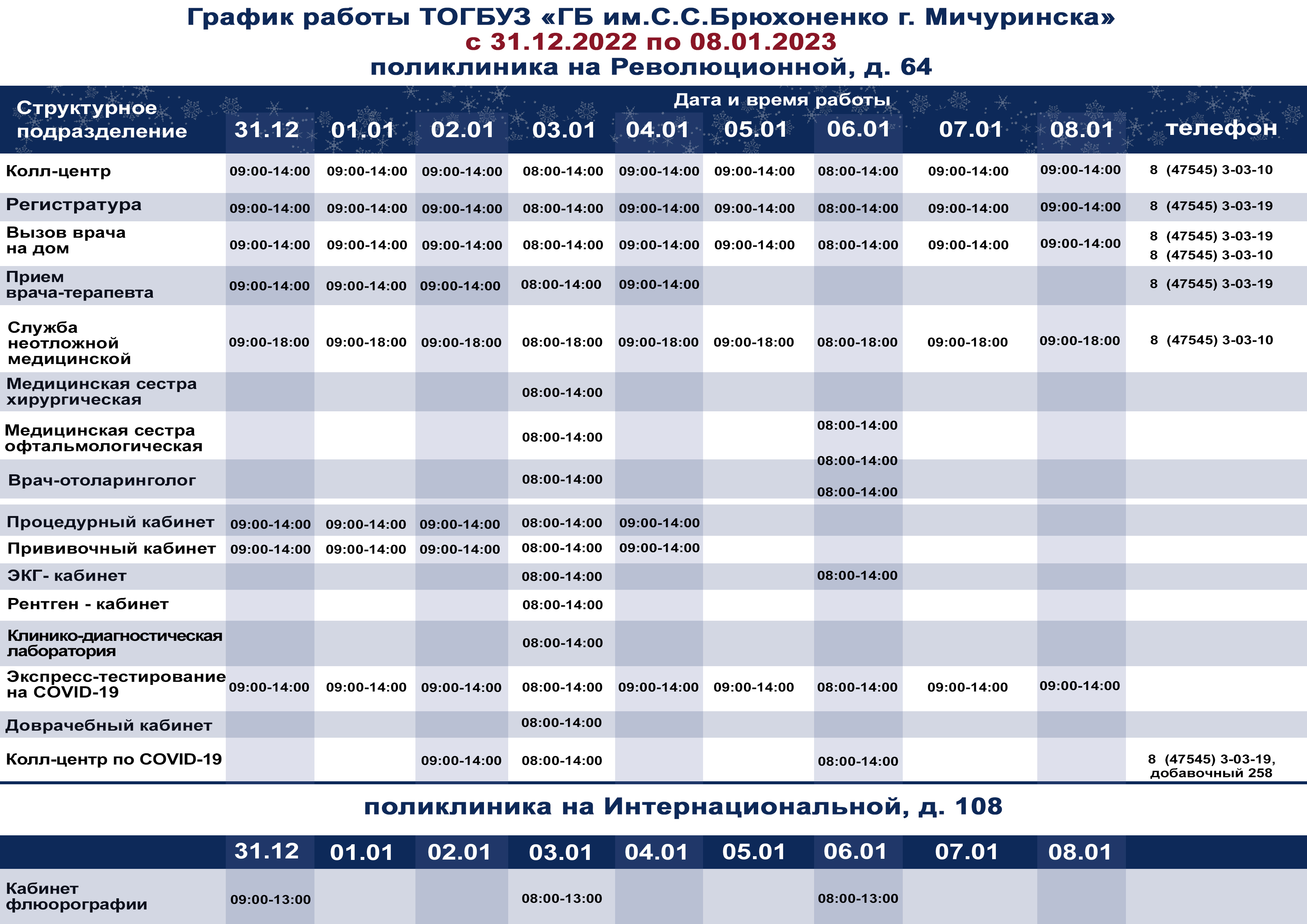 Напоминаем, что завтра, 3 января с 08:00 до 14:00 будет дежурить поликлиника на ул. Революционной, дом 64.