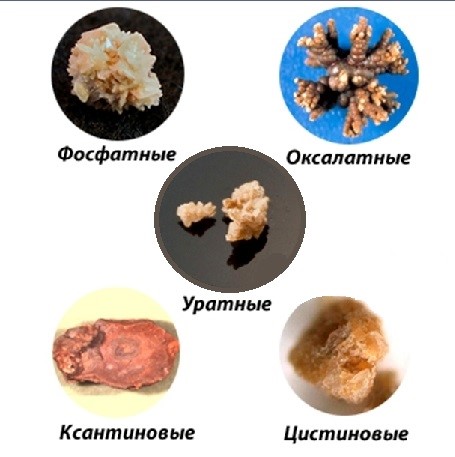 Камни одного вида формируются примерно у половины пациентов с мочекаменной болезнью. При этом в 70-80% случаев образуются камни, состоящие из неорганических соединений кальция (карбонаты, фосфаты, оксалаты). 5-10% камней содержат соли магния. Около 15% камней при мочекаменной болезни образовано производными мочевой кислоты. Белковые камни образуются в 0,4-0,6% случаев (при нарушении обмена определенных аминокислот в организме). У остальных пациентов с мочекаменной болезнью формируются полиминеральные камни.