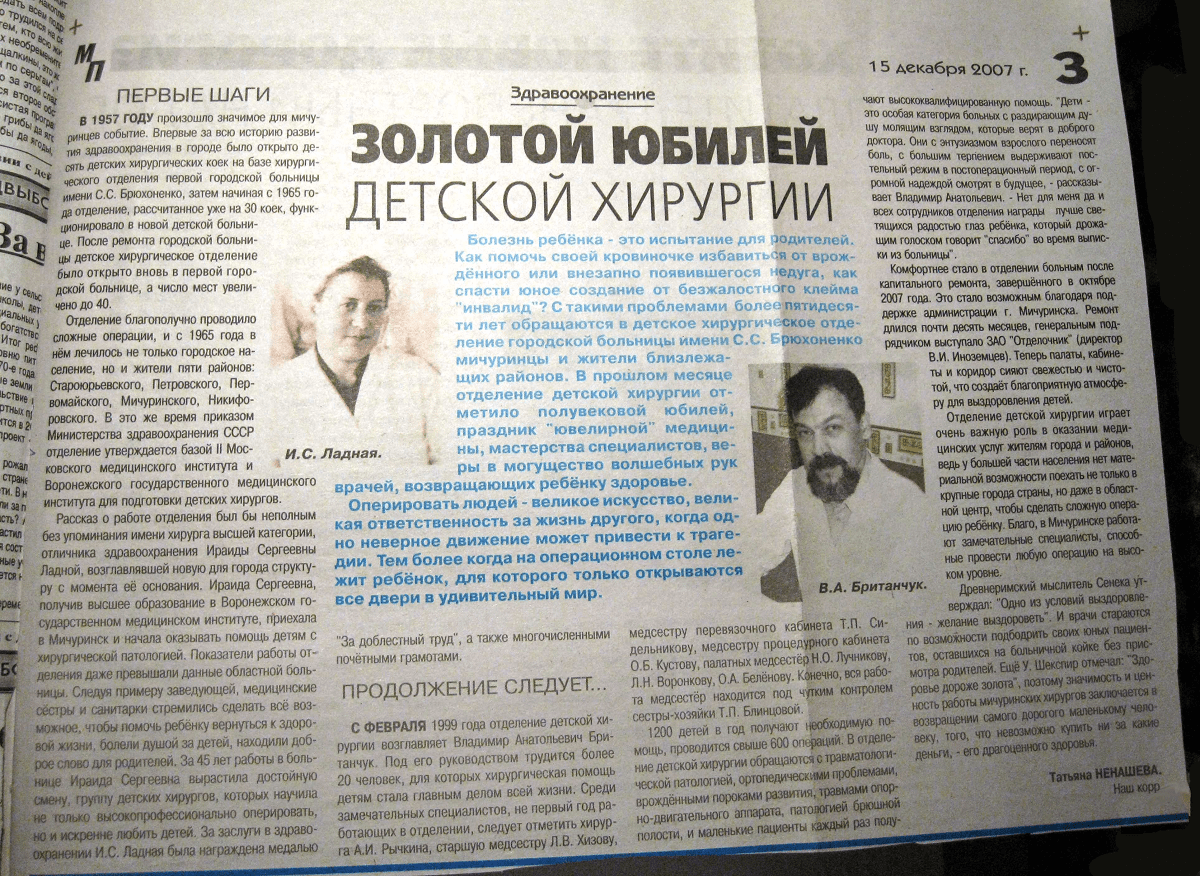 Рассказ о работе отделения был бы неполным без упоминания имени хирурга высшей категории, отличника здравоохранения Ираиды Сергеевны Ладной, возглавлявшей новую для города структуру с момента её основания. Ираида Сергеевна, получив высшее образование в Воронежском государственном медицинском институте, приехала в Мичуринск и начала оказывать помощь детям с хирургической патологией. Показатели работы отделения даже превышали данные областной больницы. Следуя примеру заведующей, медицинские сёстры и санитарки стремились сделать всё возможное, чтобы помочь ребёнку вернуться к здоровой жизни, болели душой за детей, находили доброе слово для родителей. За 45 лет работы в больнице Ираида Сергеевна вырастила достойную смену, группу детских хирургов, которых научила не только высокопрофессионально оперировать, но и искренне любить детей. За заслуги в здравоохранении И.С. Ладная была награждена медалью «За доблестный труд», а также многочисленными почётными грамотами.