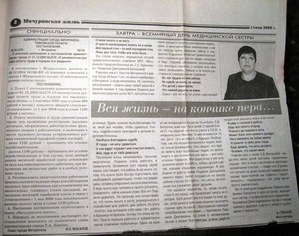 Эти строки написаны медицинской сестрой травматологического отделения МУЗ «Мичуринская городская больница им. С. С. Брюхоненко» Людмилой Дмитриевной Белоусовой.