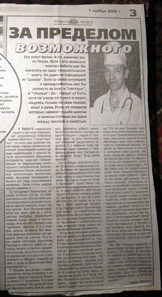 Когда после окончания десятилетки встал вопрос о выборе профессии, Антон долго задумываться не стал. Его увлечением всегда была физика, и поэтому он решил поступать в Московский физико-технический институт. И уже успешно выдержал почти все вступительные испытания… Но судьба, как говорят, — злодейка, и на последнем экзамене стало ясно, что с физикой Антону не по пути. Жалеет ли об этом доктор Зотов теперь, по прошествии многих лет? Когда говорит, что мечта не сбылась, по глазам видно — лукавит. Без своей хирургии Антон Юрьевич и дня прожить не может. Что там день! Вызывают даже ночью, когда срочно требуются именно его руки. Золотые! Иначе и не скажешь, ведь многие, казалось бы уже обречённые люди после операции, грамотно проведённой опытным хирургом, не только встают на ноги, но и полноценно живут дальше, всю жизнь вспоминая добрыми словами доктора Зотова. Хотя, что скрывать, не всегда всё складывается гладко. От потерь никто не застрахован… На всё Божья воля. Но поверьте моему слову: Антон Юрьевич переживает за каждого своего больного — старика или совсем ещё малышку. Он не только оказывает оперативную помощь, он выхаживает пациента в послеоперационный период в полном смысле этого слова! Кто чаще всего из врачей заходит в палату к своим пациентам, чтобы лишний раз поинтересоваться их самочувствием или измерить давление? Зотов! Кто более подробно расскажет родственникам заболевшего, чем его надо кормить в послеоперационный период? Зотов! Кто назначит лечение и самолично поинтересуется у больного о его состоянии после принятия того или иного лекарства? Зотов! Можно перечислять бесконечно, но факт остаётся фактом — побольше бы таких врачей.