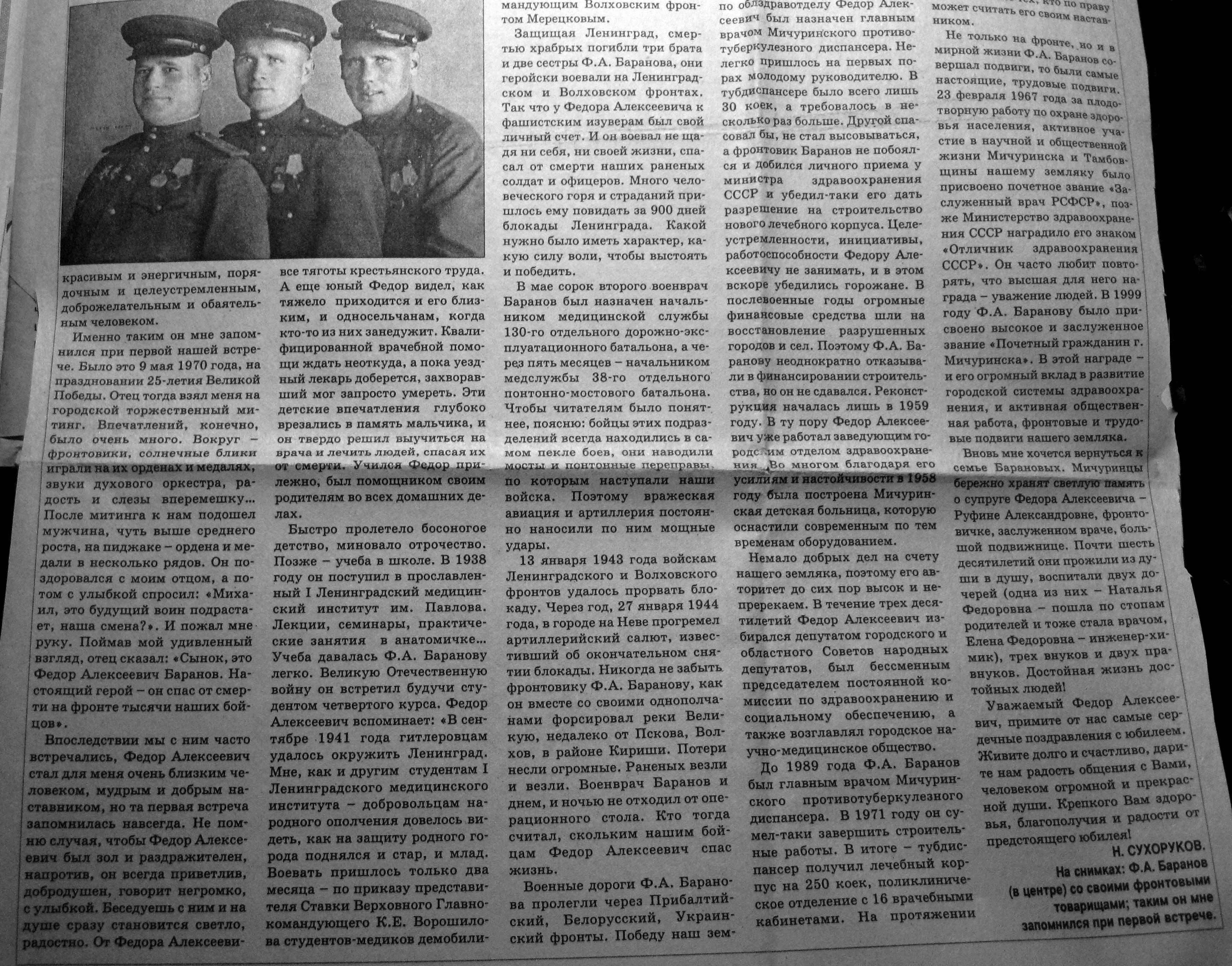 Имя Фёдора Алексеевича Баранова хорошо знакомо в нашем городе многим. Почётный гражданин г. Мичуринска, заслуженный врач РСФСР, фронтовик, он вписал немало ярких и памятных страниц в летопись Мичуринска. Более полувека Фёдор Алексеевич отдал работе в системе здравоохранения. По моему глубокому убеждению, он и его супруга Руфина Александровна – врачи от Бога, милосердные, отзывчивые люди, всегда готовые прийти на помощь своему ближнему, интеллигенты и настоящие подвижники. Их вклад в развитие городской системы здравоохранения огромен и неоценим.