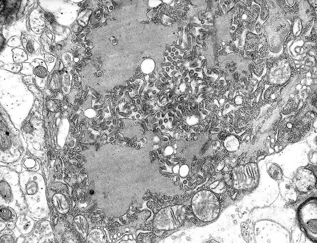 С места внедрения (укуса) вирус проникает в спинной, а затем головной мозг. Под воздействием вируса происходит дегенерация нервных клеток головного и спинного мозга, что обусловливает различные неврологические нарушения и гибель животных от асфиксии (паралича дыхательной мускулатуры).
