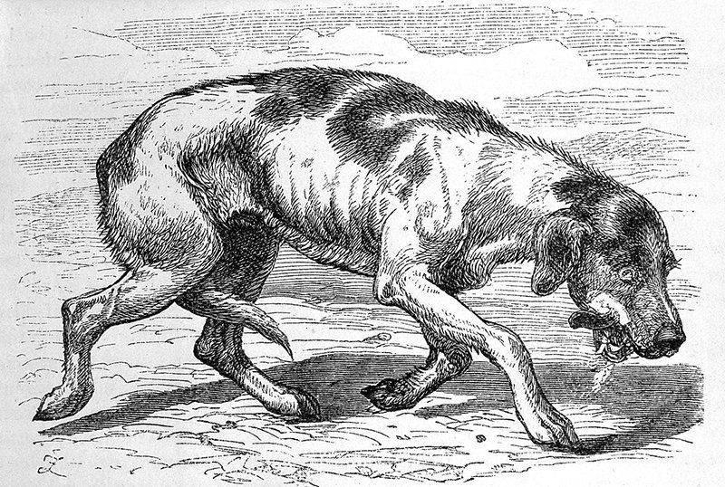 При паралитической форме бешенства рано проявляются параличи, голос становится хриплым, затруднено глотание, отмечается сильное слюнотечение. У хозяина создается впечатление, что собака подавилась костью, он пытается извлечь ее из пасти, подвергая себя заражению.