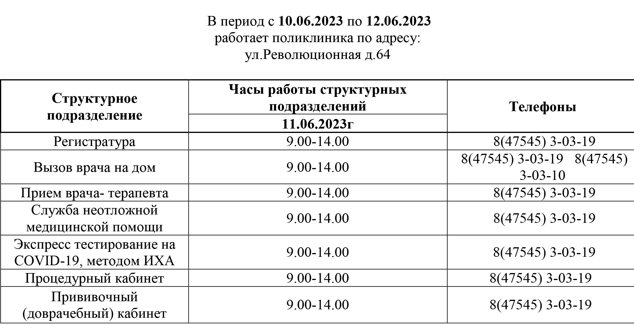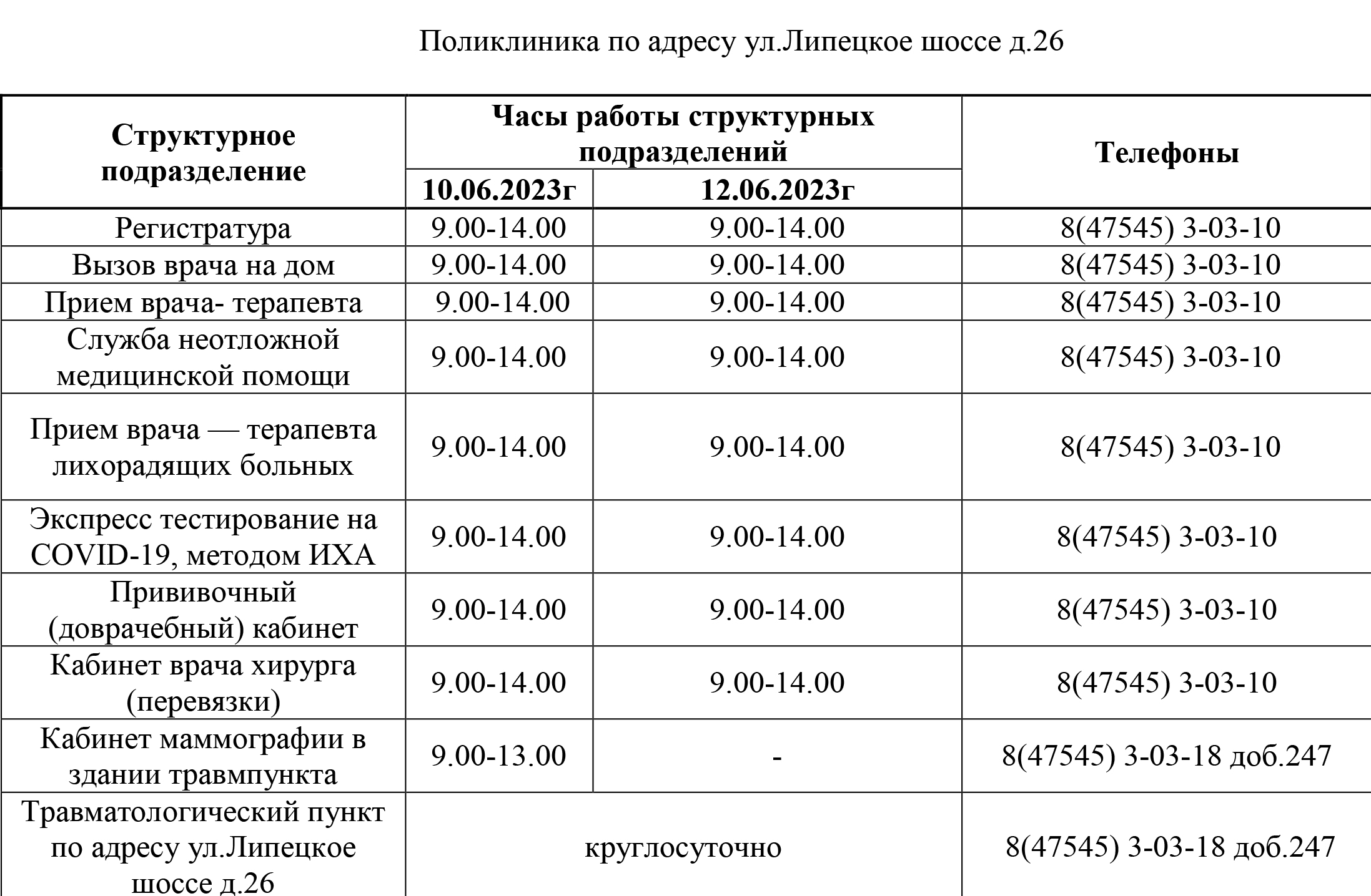 Обратите внимание на режим работы поликлиник ТОГБУЗ «ГБ им. С.С. Брюхоненко г. Мичуринска» в праздничные дни с 10 по 12 июня 2023 года.