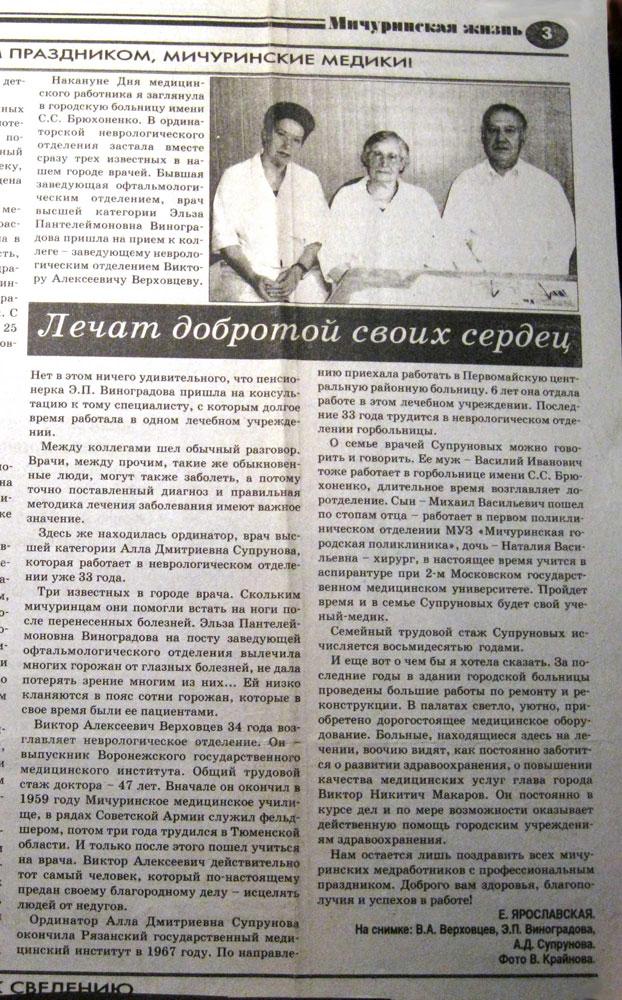 Три известных в городе врача. Скольким мичуринцам они помогли встать на ноги после перенесённых болезней. Эльза Пантелеймоновна Виноградова на посту заведующей офтальмологического отделения вылечила многих горожан от глазных болезней, не дала потерять зрение многим из них… Ей низко кланяются в пояс сотни горожан, которые в своё время были её пациентами.