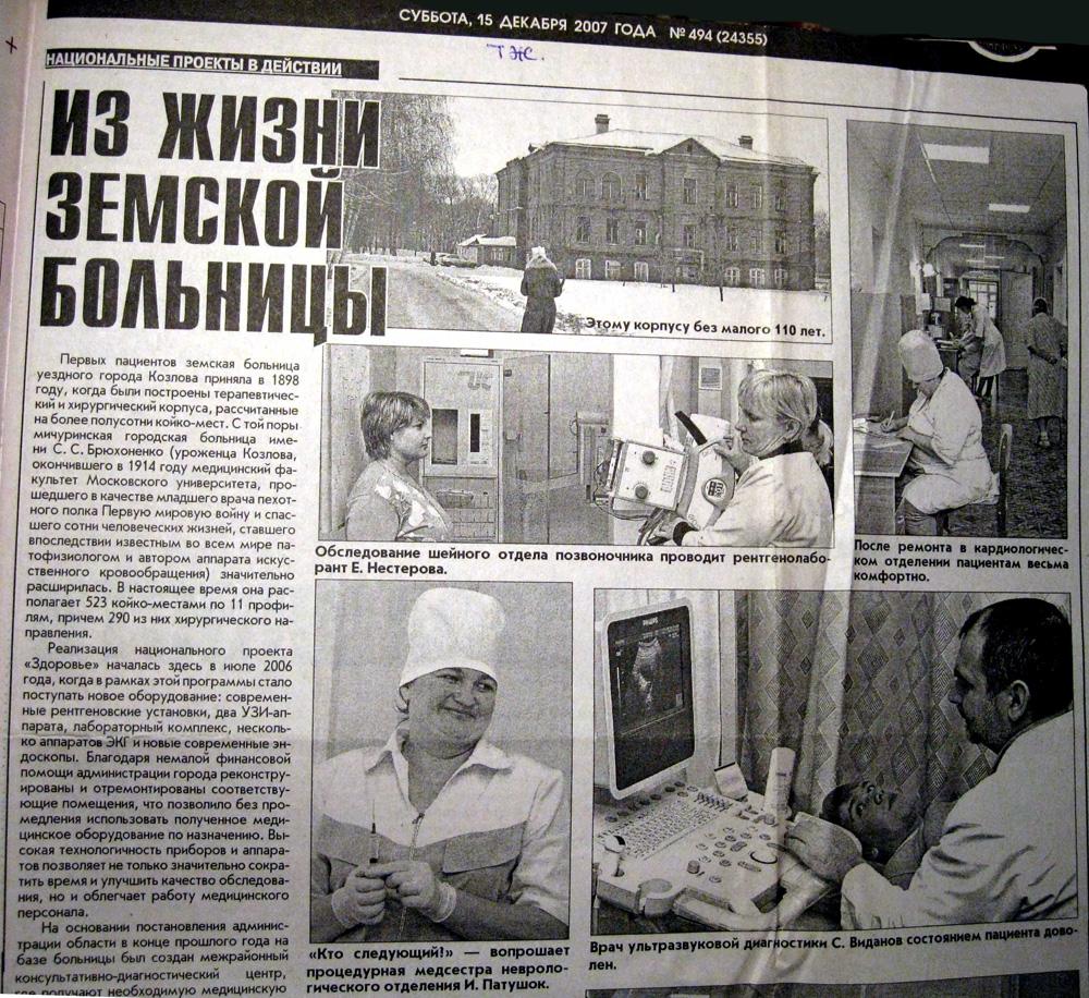 На основании постановления администрации области в конце прошлого года на базе больницы был создан межрайонный консультативно-диагностический центр, где получают необходимую медицинскую помощь жители Мичуринского, Никифоровского, Первомайского, Петровского и Староюрьевского районов. По данным администрации больницы, на полученном за время реализации национального проекта «Здоровье» медицинском оборудовании прошли необходимые обследования около сорока двух тысяч жителей этих районов.