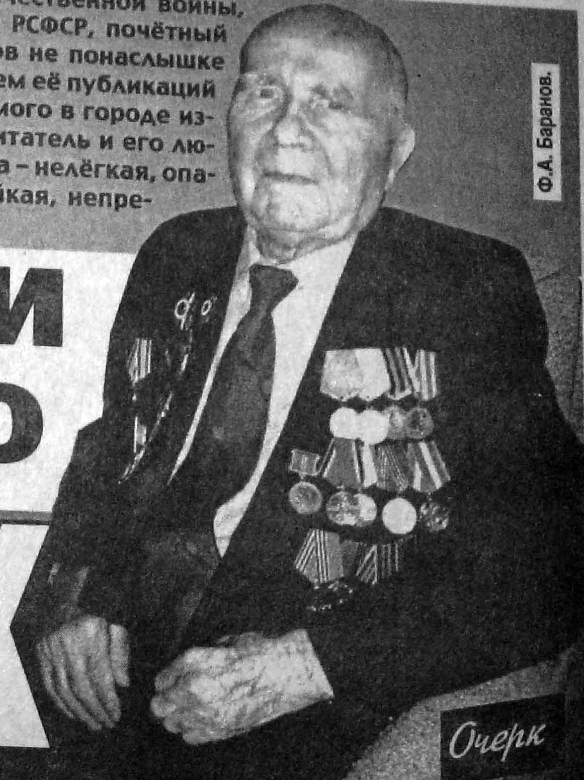 Ровесник "Мичуринской правды", ветеран Великой Отечественной войны, заслуженный врач РСФСР, отличник санитарной обороны РСФСР, почётный гражданин города Мичуринска Фёдор Алексеевич Баранов не понаслышке знаком с нашей газетой. Неоднократно он становился героем её публикаций да и сам нередко выступал со страниц самого тиражируемого в городе издания. Больше полстолетия идут они вместе по жизни – читатель и его любимая "Мичуринская правда". И судьба их во много схожа – нелёгкая, опалённая войной, выстраданная, но такая интересная, стойкая, непреклонная, несгибаемая, как сама Правда.