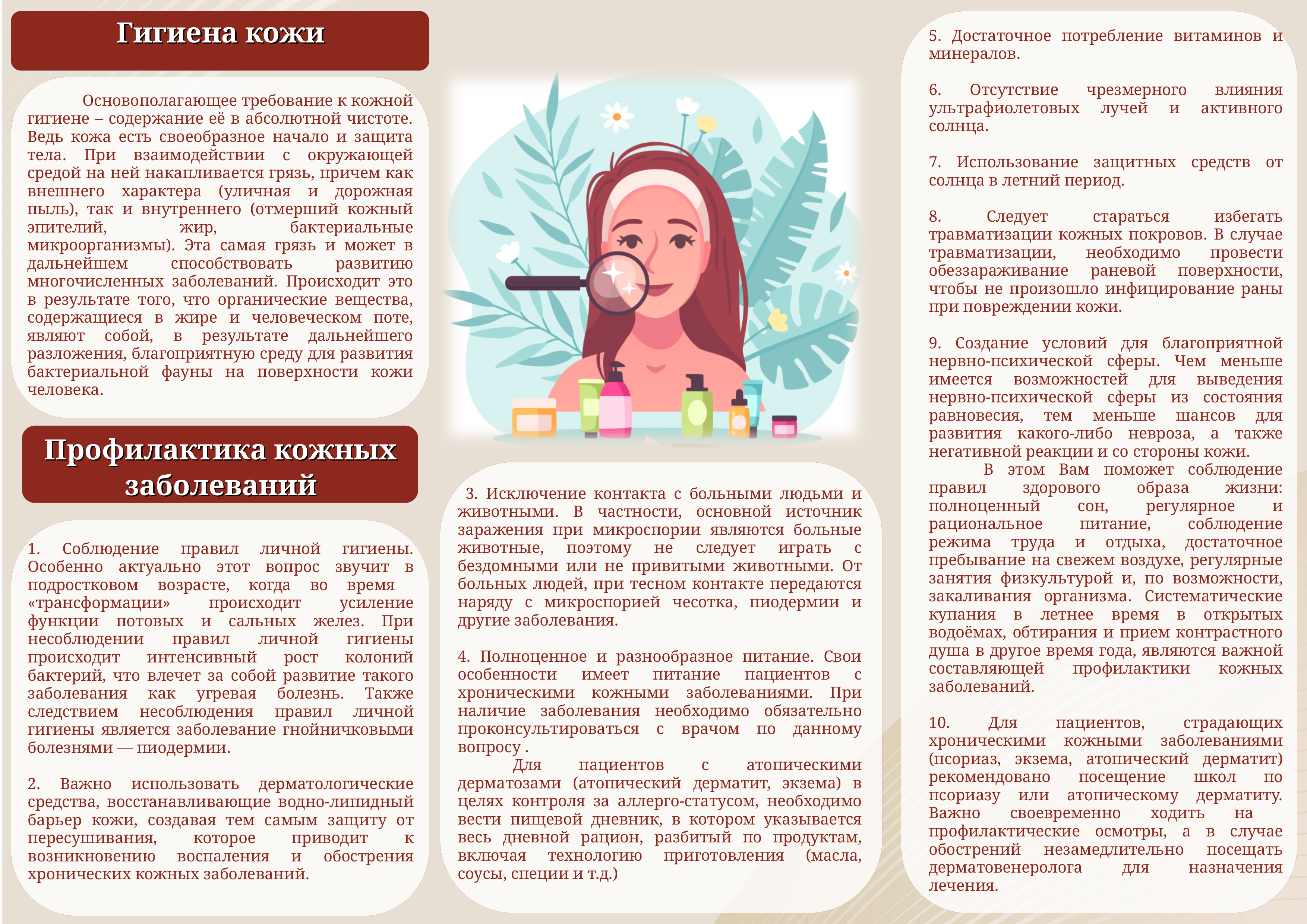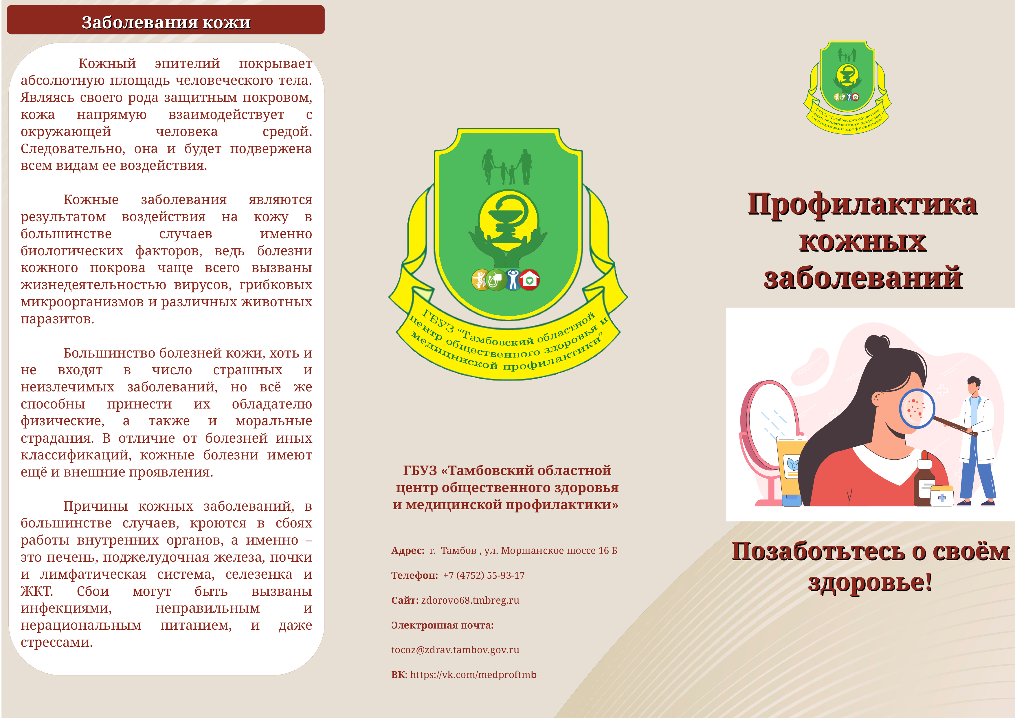О причинах возникновения кожных заболеваний и их профилактике подробно рассказали наши коллеги из ГБУЗ «Тамбовский областной центр общественного здоровья и медицинской профилактики» в своей памятке.